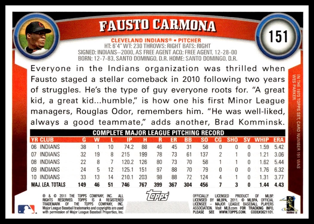 This Baseball card, from 2011 is part of the Topps  card set. Fausto Carmona is featured and has a card number of 151.