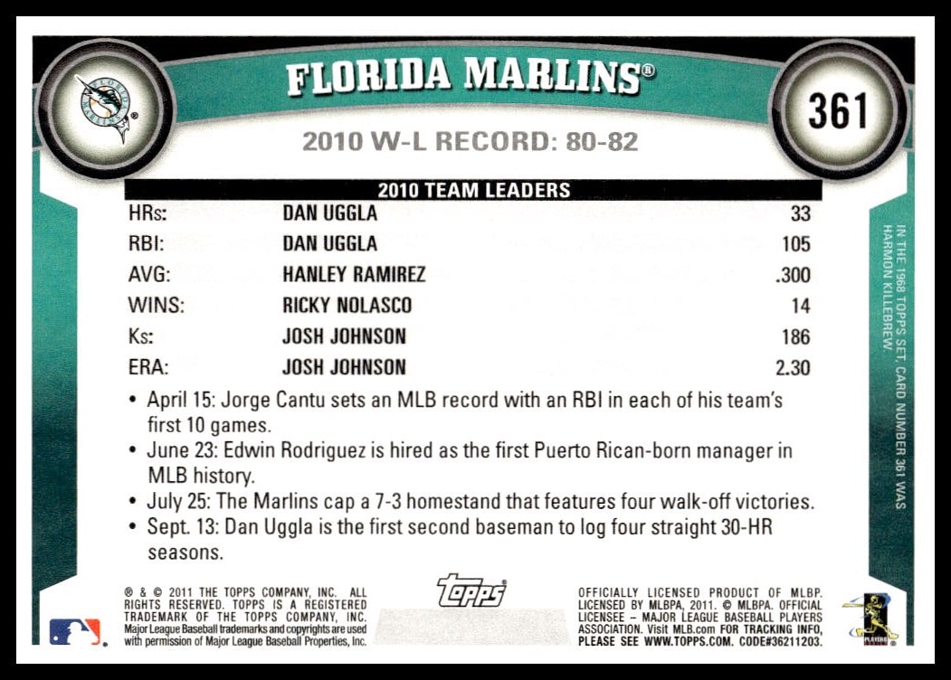 This Baseball card, from 2011 is part of the Topps  card set. Florida Marlins is featured and has a card number of 361.