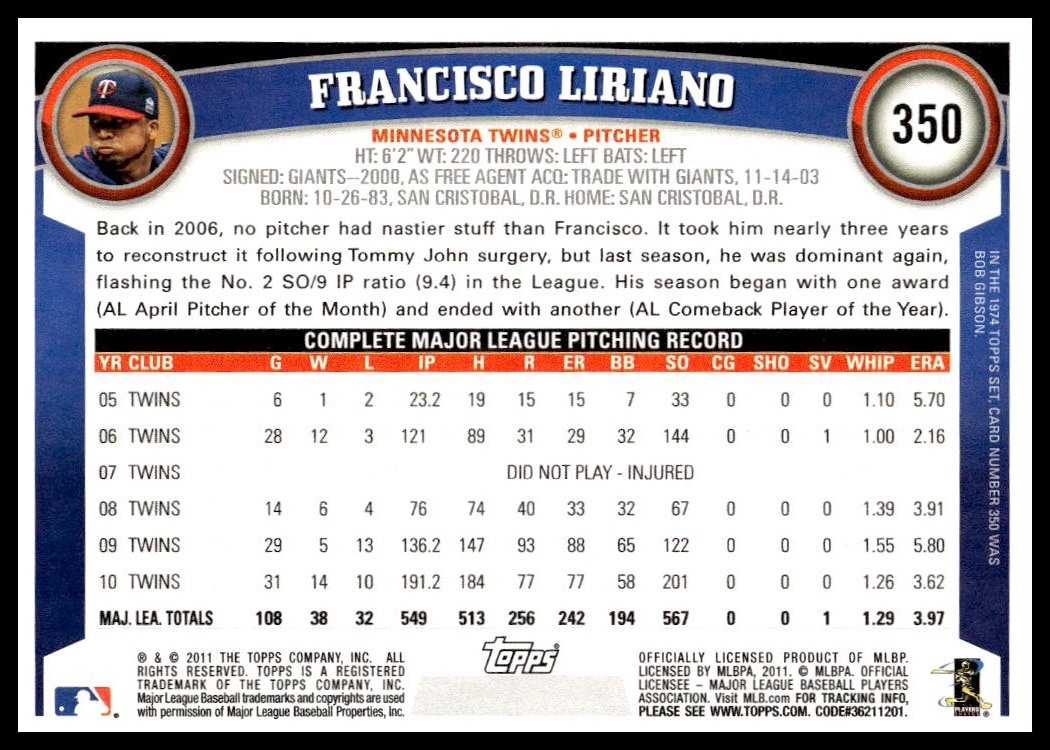 This Baseball card, from 2011 is part of the Topps  card set. Francisco Liriano is featured and has a card number of 350.