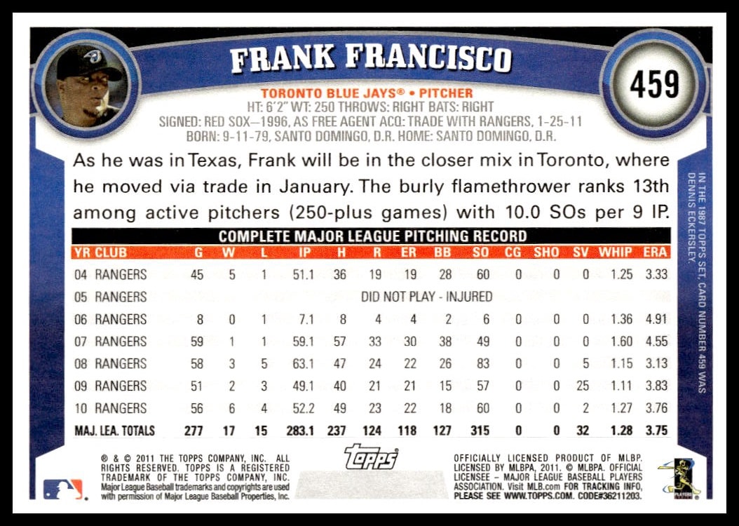 This BaseballΒ card, from 2011 is part of the Topps Β card set. Frank Francisco is featured and has a card number of 459.