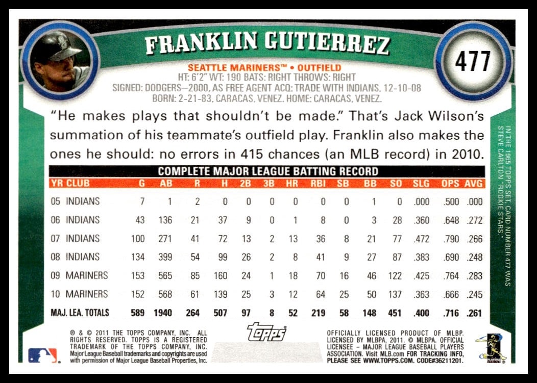 This BaseballΒ card, from 2011 is part of the Topps Β card set. Franklin Gutierrez is featured and has a card number of 477.