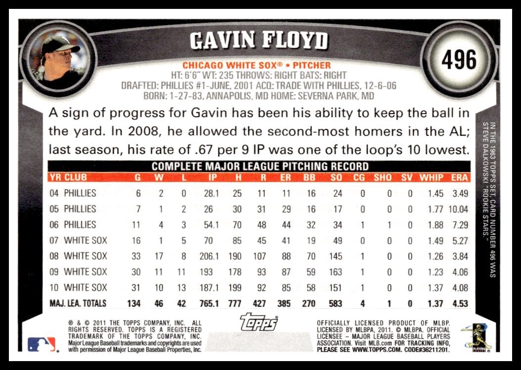 This Baseball card, from 2011 is part of the Topps  card set. Gavin Floyd is featured and has a card number of 496.