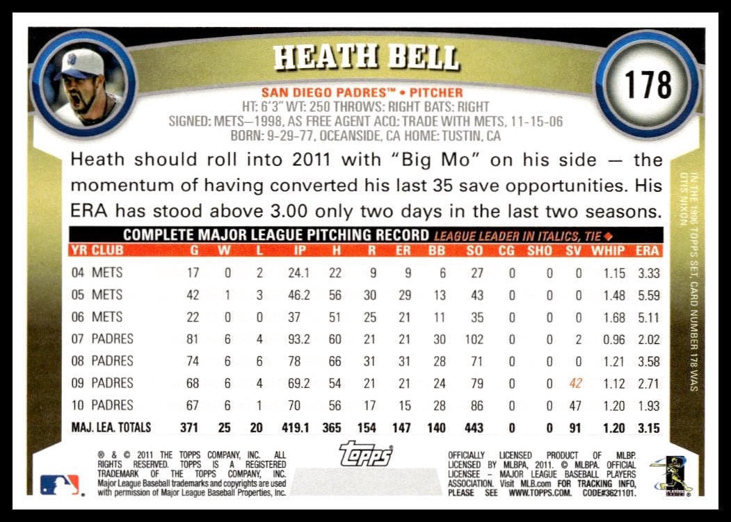 This Baseball card, from 2011 is part of the Topps  card set. Heath Bell is featured and has a card number of 178.