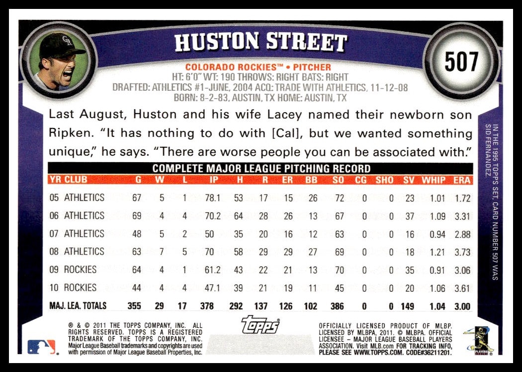 This Baseball card, from 2011 is part of the Topps  card set. Huston Street is featured and has a card number of 507.