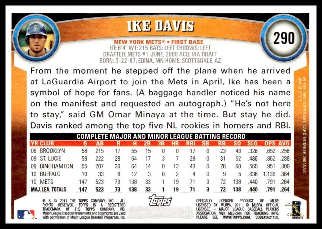 This Baseball card, from 2011 is part of the Topps  card set. Ike Davis is featured and has a card number of 290.