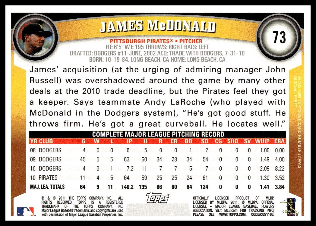 This Baseball card, from 2011 is part of the Topps  card set. James McDonald is featured and has a card number of 73.
