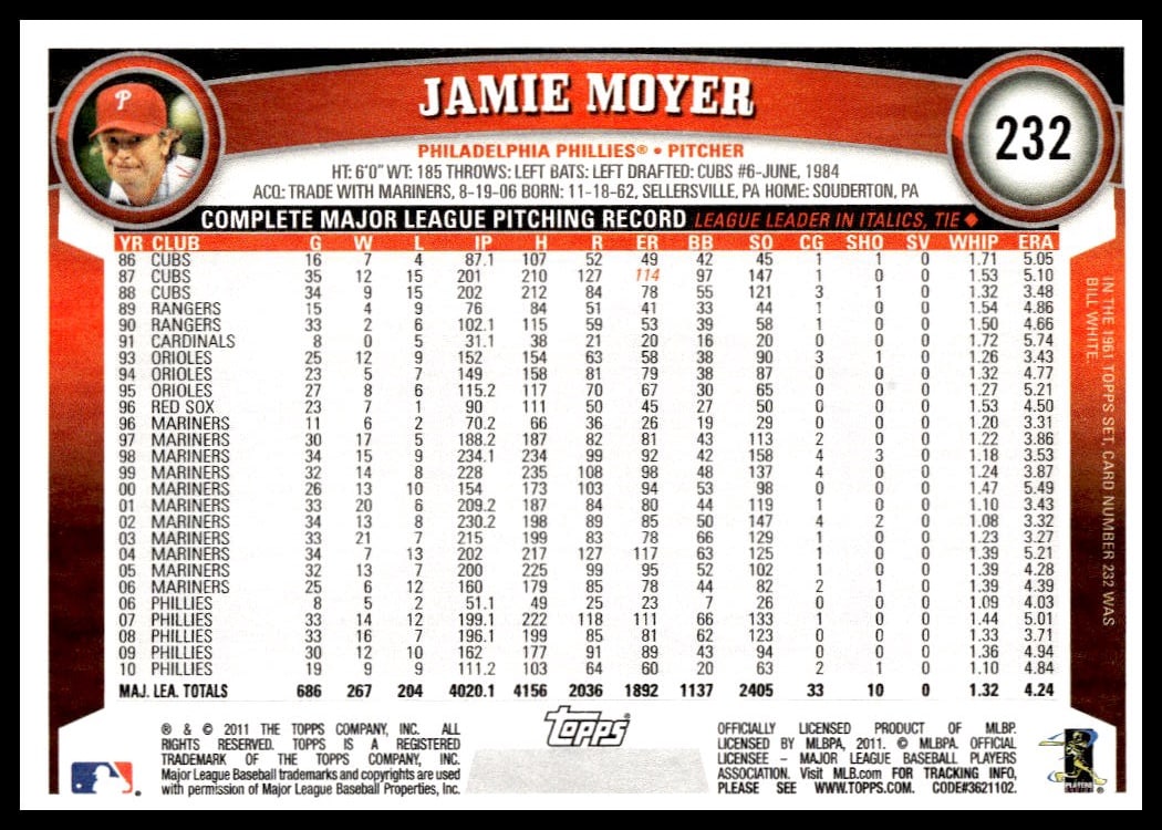 This Baseball card, from 2011 is part of the Topps  card set. Jamie Moyer is featured and has a card number of 232.