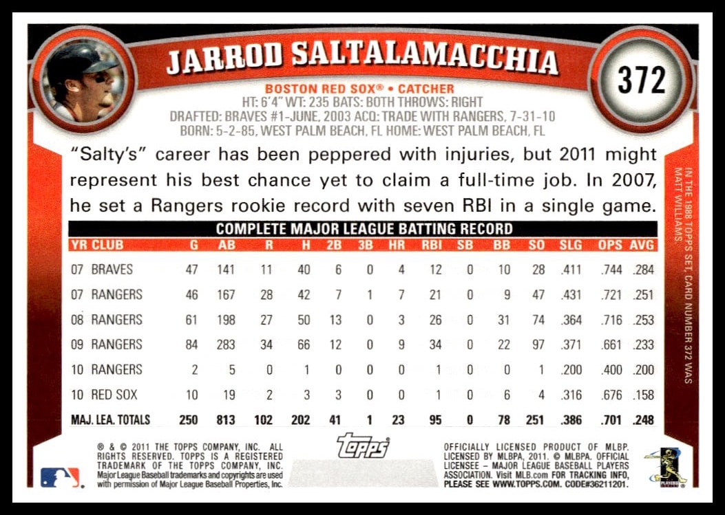 This BaseballΒ card, from 2011 is part of the Topps Β card set. Jarrod Saltalamacchia is featured and has a card number of 372.