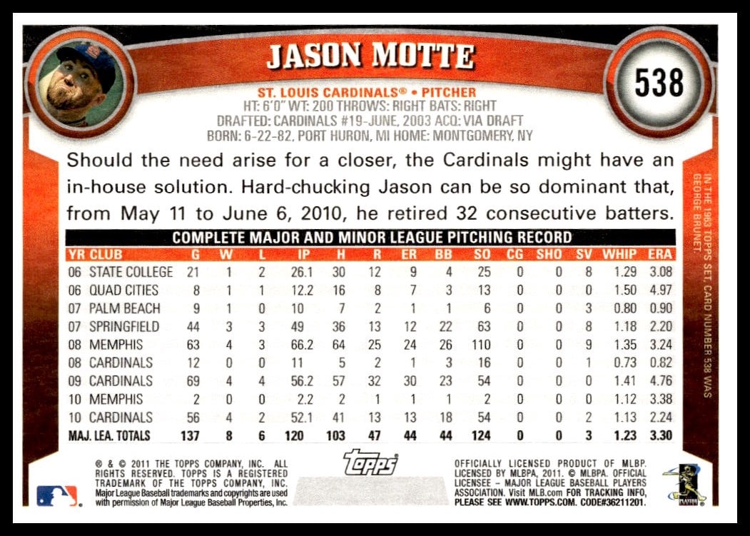 This Baseball card, from 2011 is part of the Topps  card set. Jason Motte is featured and has a card number of 538.