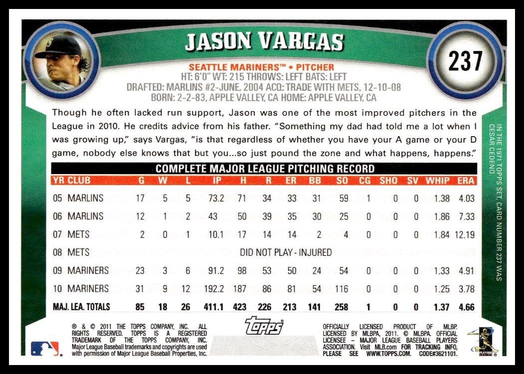 This Baseball card, from 2011 is part of the Topps  card set. Jason Vargas is featured and has a card number of 237.