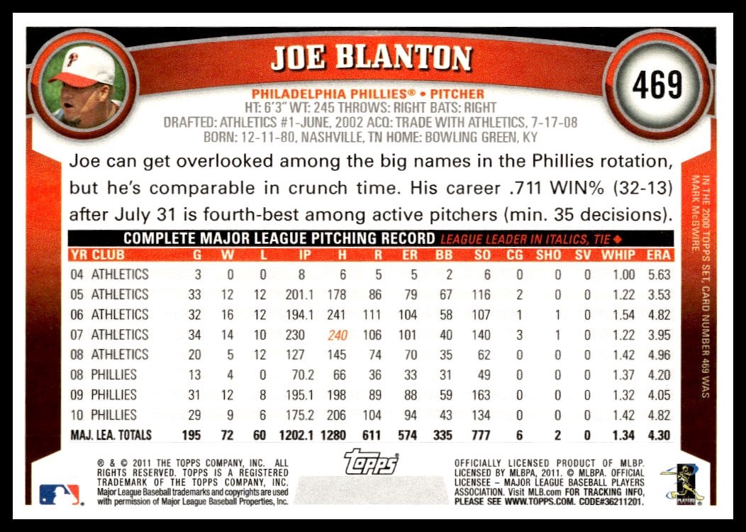 This Baseball card, from 2011 is part of the Topps  card set. Joe Blanton is featured and has a card number of 469.