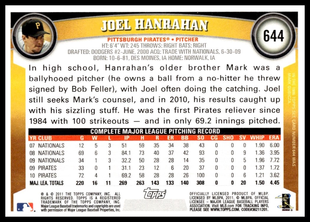 This Baseball card, from 2011 is part of the Topps  card set. Joel Hanrahan is featured and has a card number of 644.
