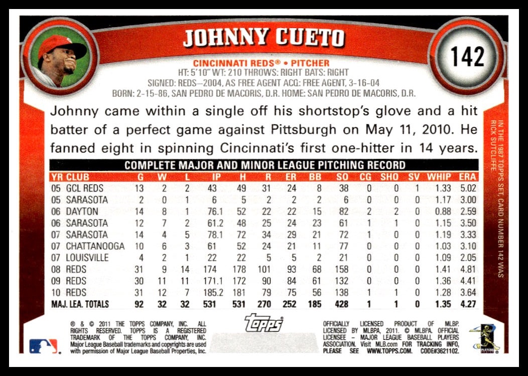 This Baseball card, from 2011 is part of the Topps  card set. Johnny Cueto is featured and has a card number of 142.