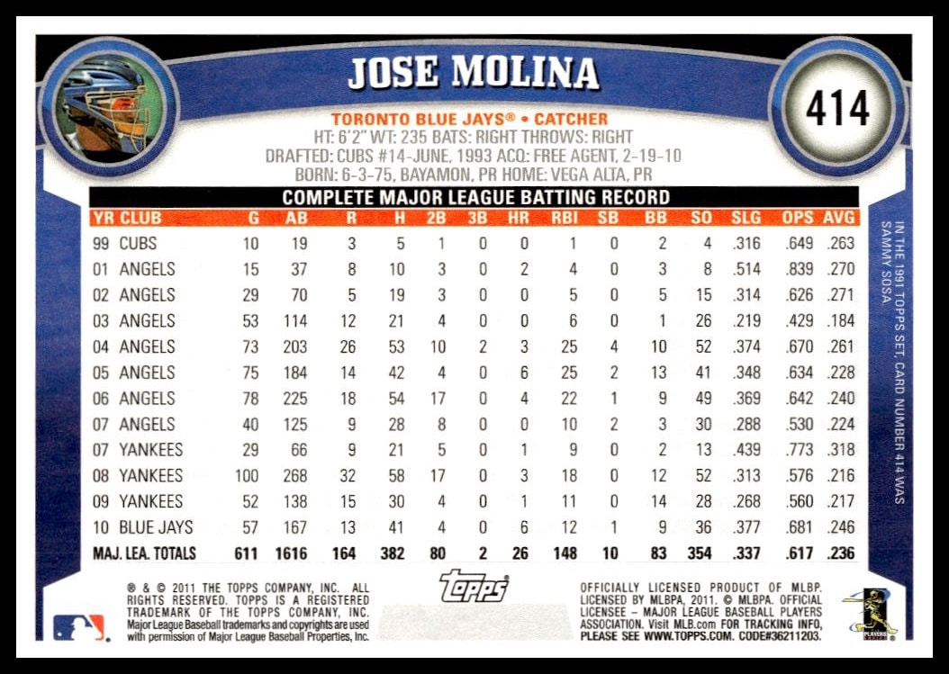 This Baseball card, from 2011 is part of the Topps  card set. Jose Molina is featured and has a card number of 414.