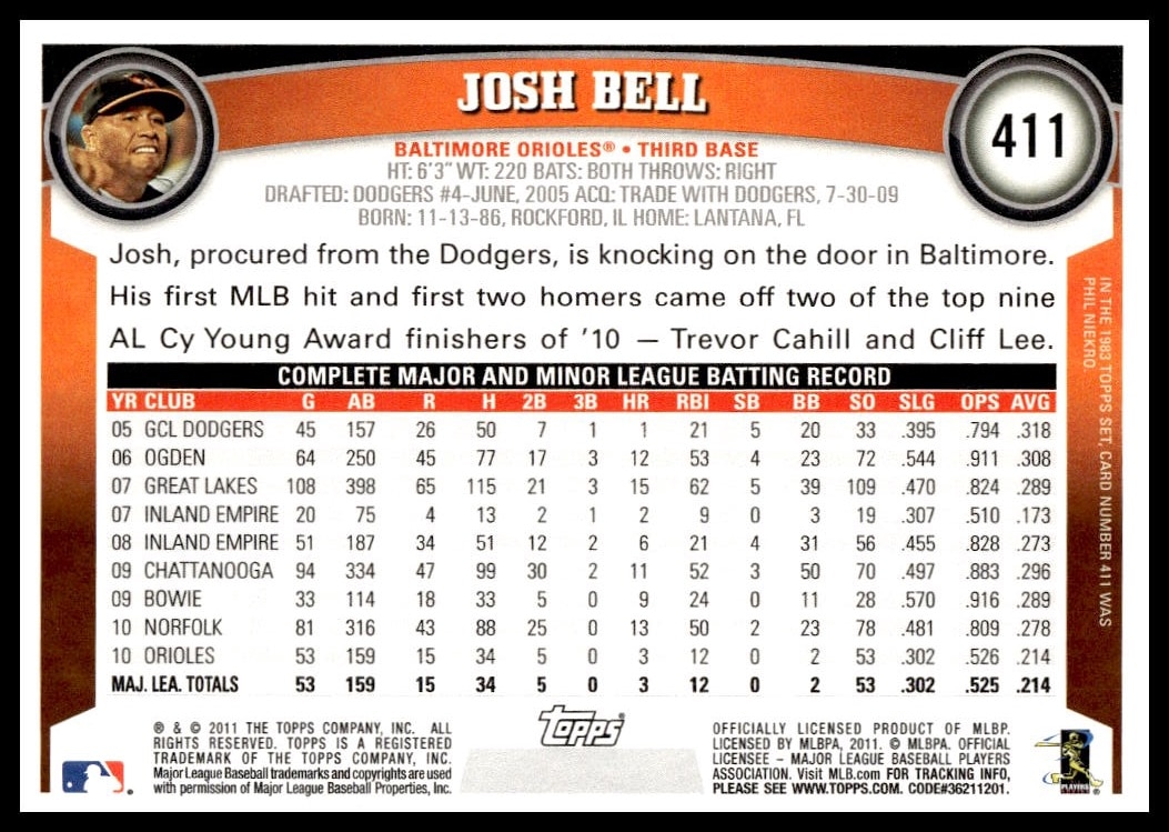 This Baseball card, from 2011 is part of the Topps  card set. Josh Bell is featured and has a card number of 411.