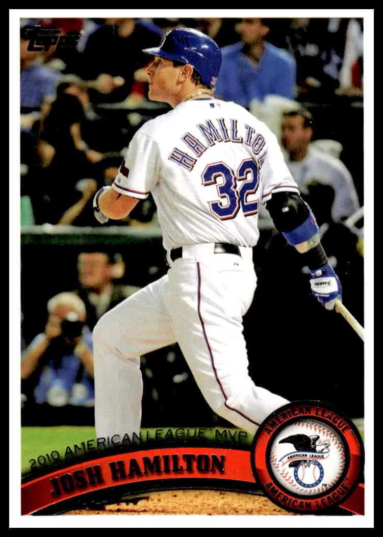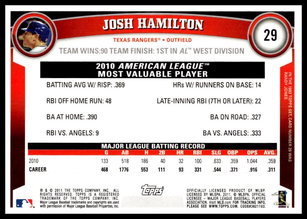 This Baseball card, from 2011 is part of the Topps  card set. Josh Hamilton is featured and has a card number of 29.