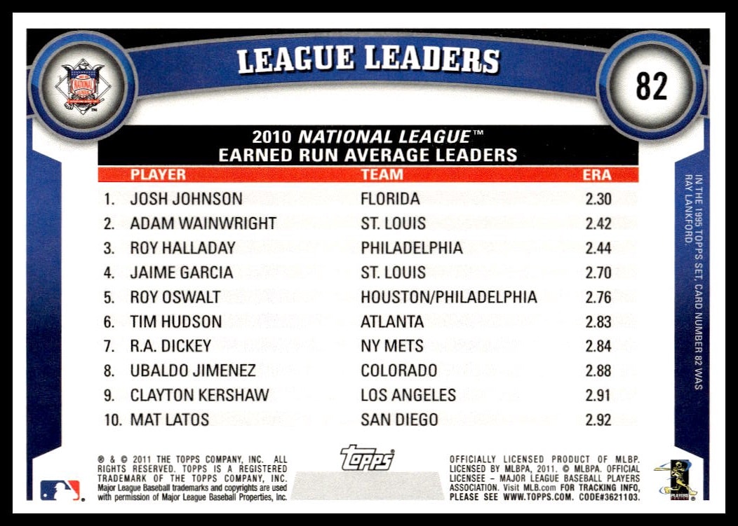 This Baseball card, from 2011 is part of the Topps  card set. Josh Johnson / Adam Wainwright / Roy Halladay is featured and has a card number of 82.