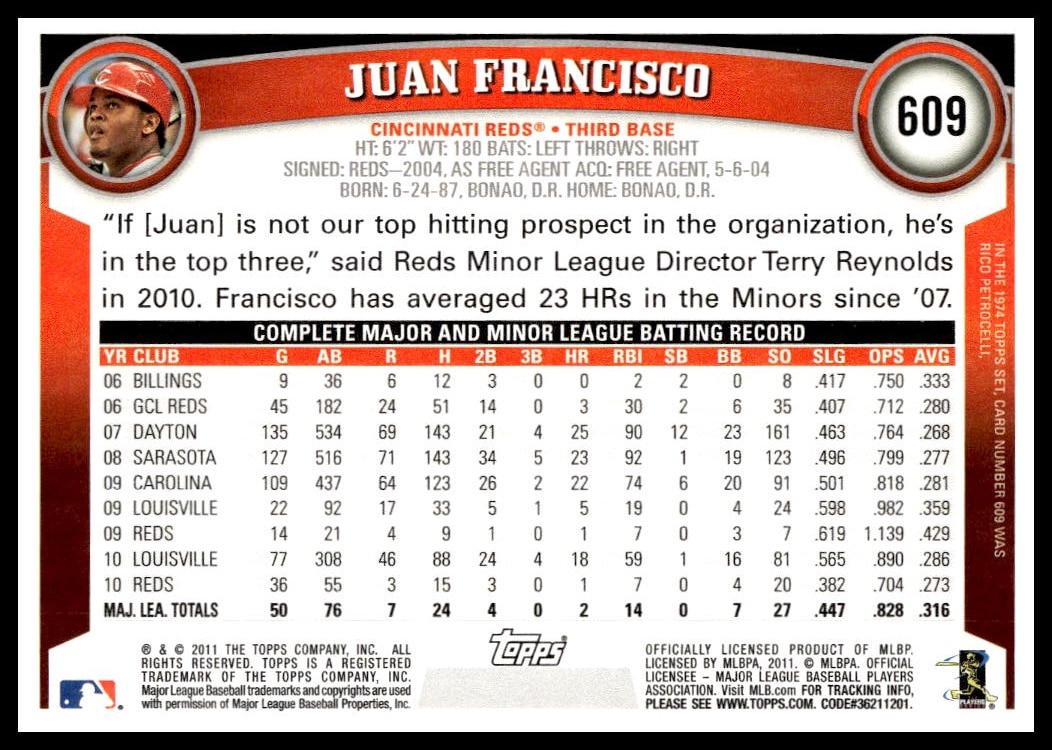 This BaseballΒ card, from 2011 is part of the Topps Β card set. Juan Francisco is featured and has a card number of 609.