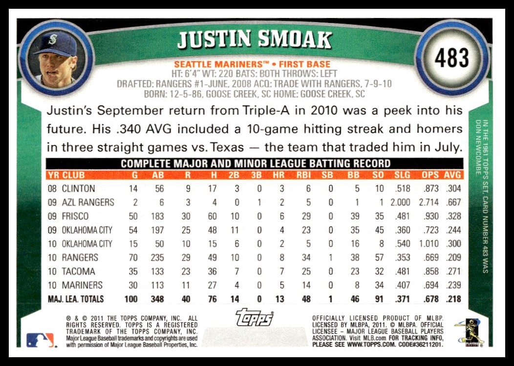 This Baseball card, from 2011 is part of the Topps  card set. Justin Smoak is featured and has a card number of 483.