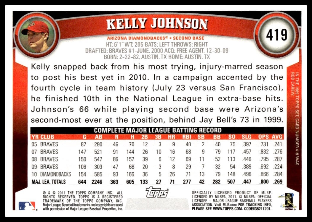 This BaseballΒ card, from 2011 is part of the Topps Β card set. Kelly Johnson is featured and has a card number of 419.
