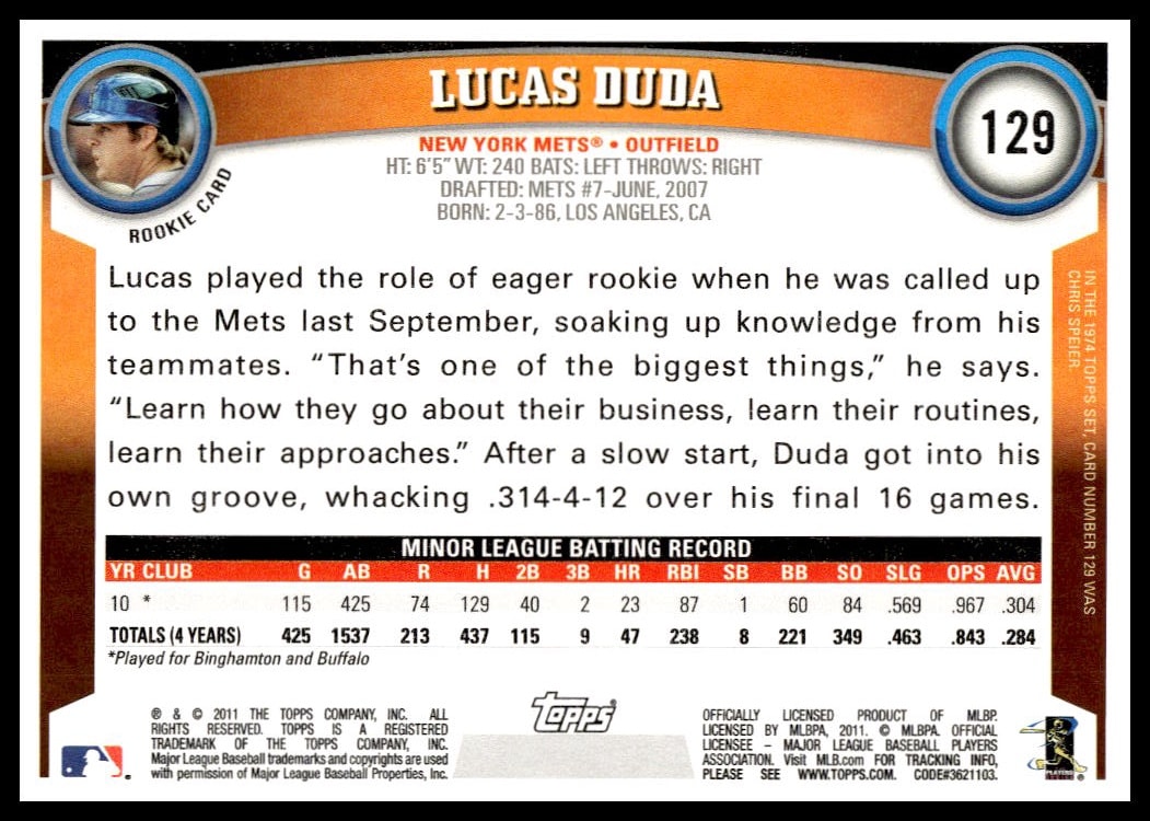 This Baseball card, from 2011 is part of the Topps  card set. Lucas Duda is featured and has a card number of 129.