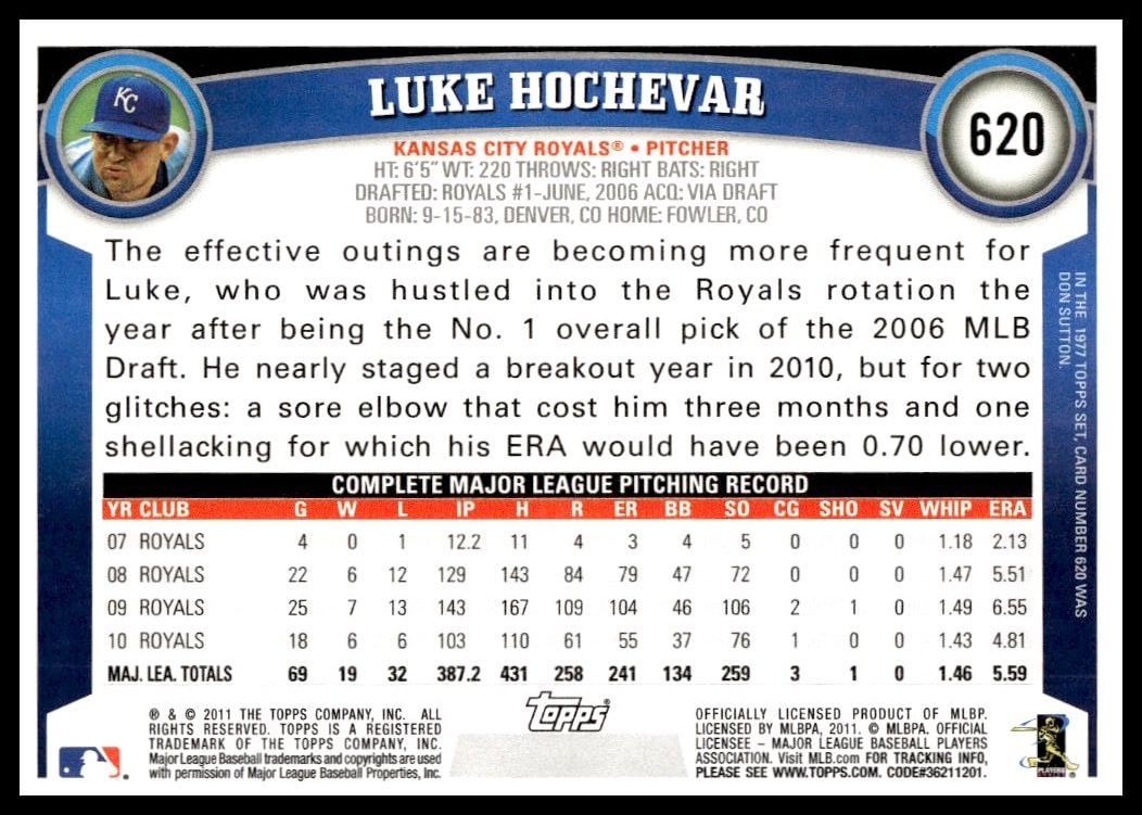 This BaseballΒ card, from 2011 is part of the Topps Β card set. Luke Hochevar is featured and has a card number of 620.