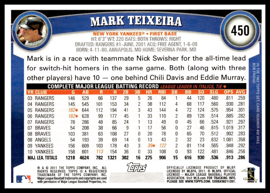 This Baseball card, from 2011 is part of the Topps  card set. Mark Teixeira is featured and has a card number of 450.