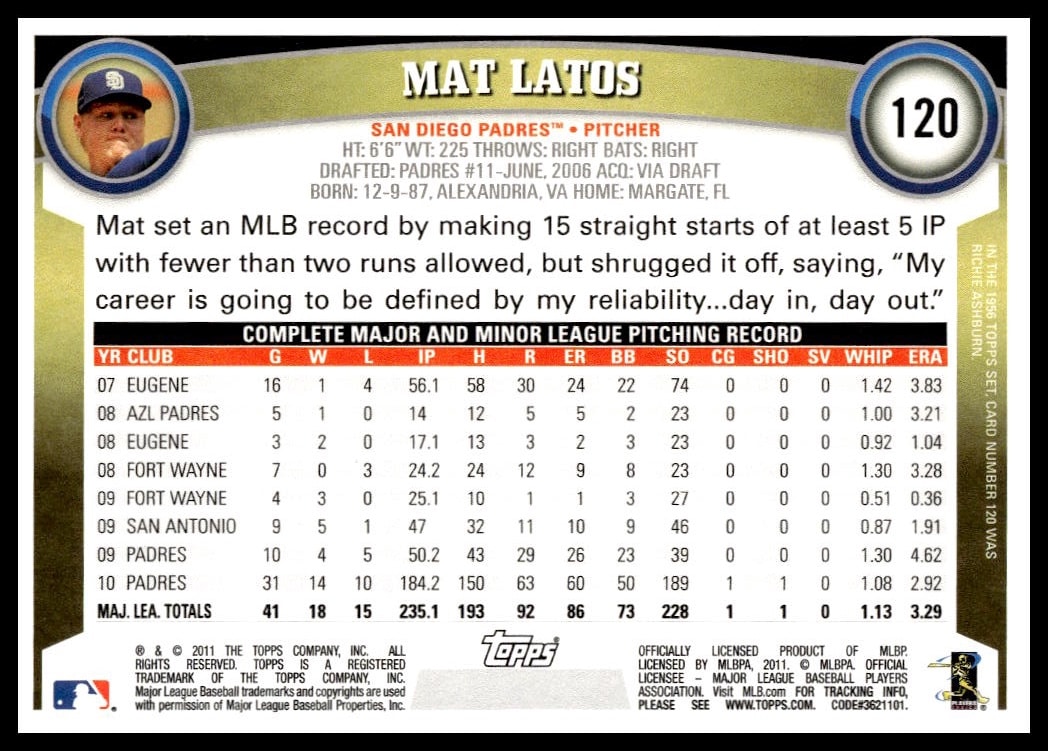 This Baseball card, from 2011 is part of the Topps  card set. Mat Latos is featured and has a card number of 120.