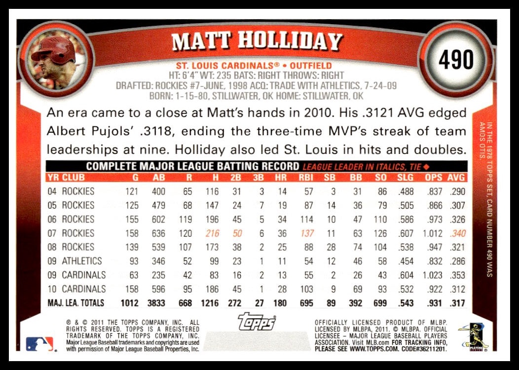 This Baseball card, from 2011 is part of the Topps  card set. Matt Holliday is featured and has a card number of 490.