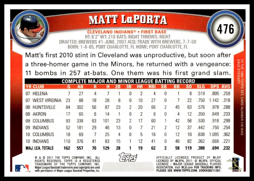 This Baseball card, from 2011 is part of the Topps  card set. Matt LaPorta is featured and has a card number of 476.