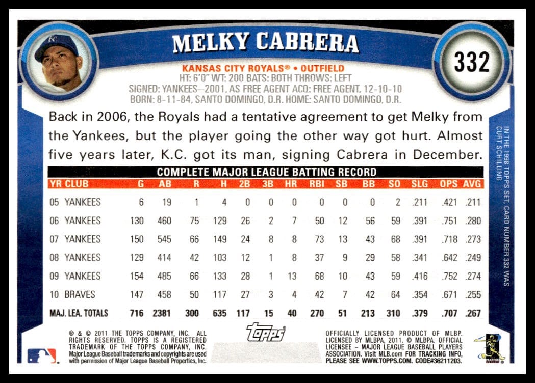 This Baseball card, from 2011 is part of the Topps  card set. Melky Cabrera is featured and has a card number of 332.