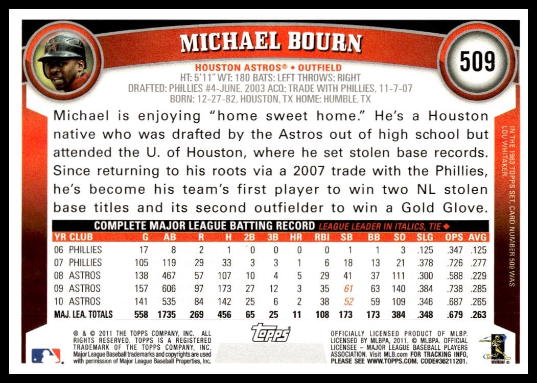 This Baseball card, from 2011 is part of the Topps  card set. Michael Bourn is featured and has a card number of 509.