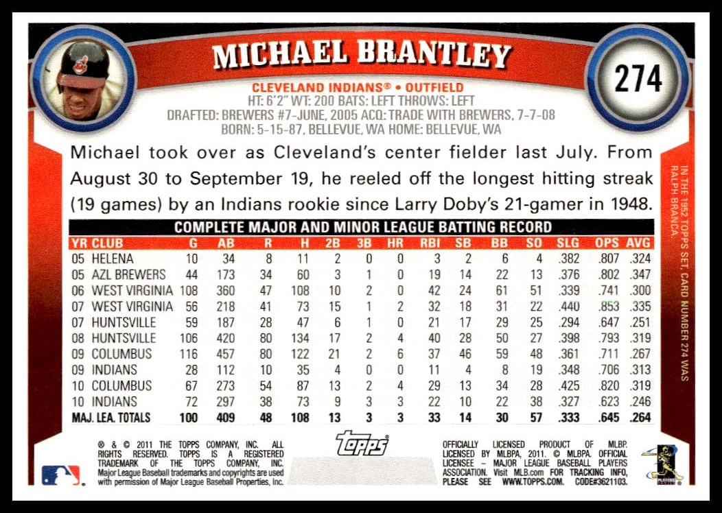 This BaseballΒ card, from 2011 is part of the Topps Β card set. Michael Brantley is featured and has a card number of 274.