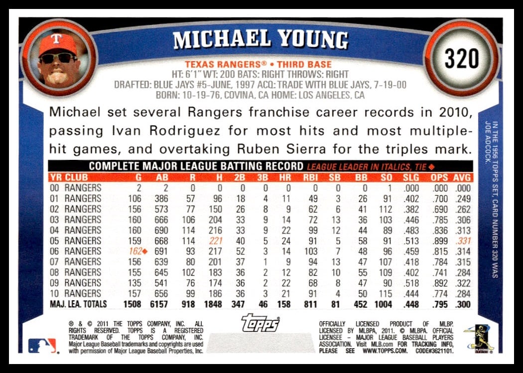 This Baseball card, from 2011 is part of the Topps  card set. Michael Young is featured and has a card number of 320.