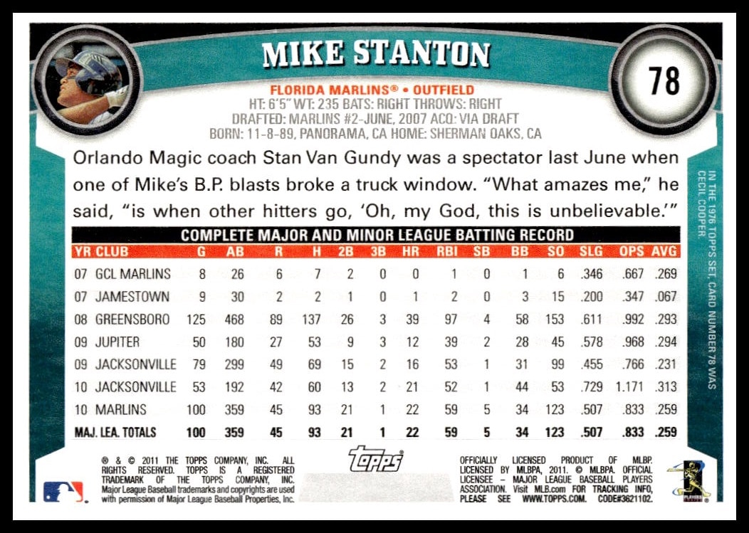 This Baseball card, from 2011 is part of the Topps  card set. Mike Stanton is featured and has a card number of 78.