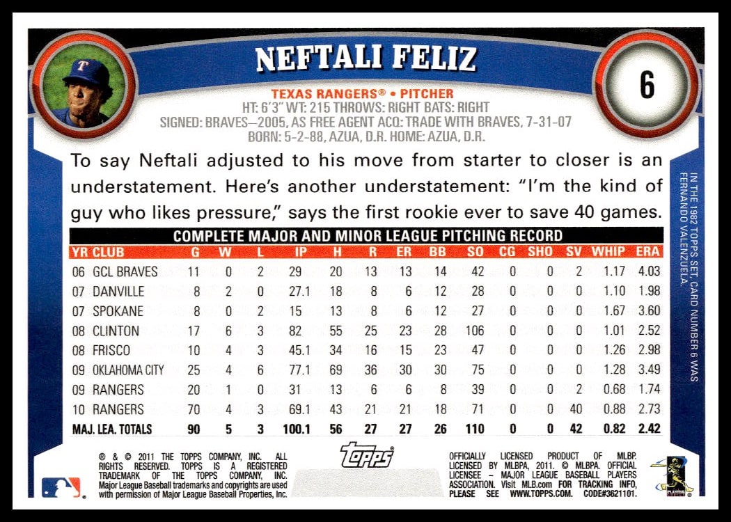 This Baseball card, from 2011 is part of the Topps  card set. Neftali Feliz is featured and has a card number of 6.