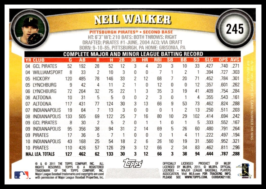 This Baseball card, from 2011 is part of the Topps  card set. Neil Walker is featured and has a card number of 245.