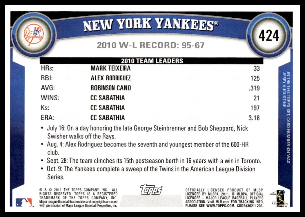 This Baseball card, from 2011 is part of the Topps  card set. New York Yankees is featured and has a card number of 424.