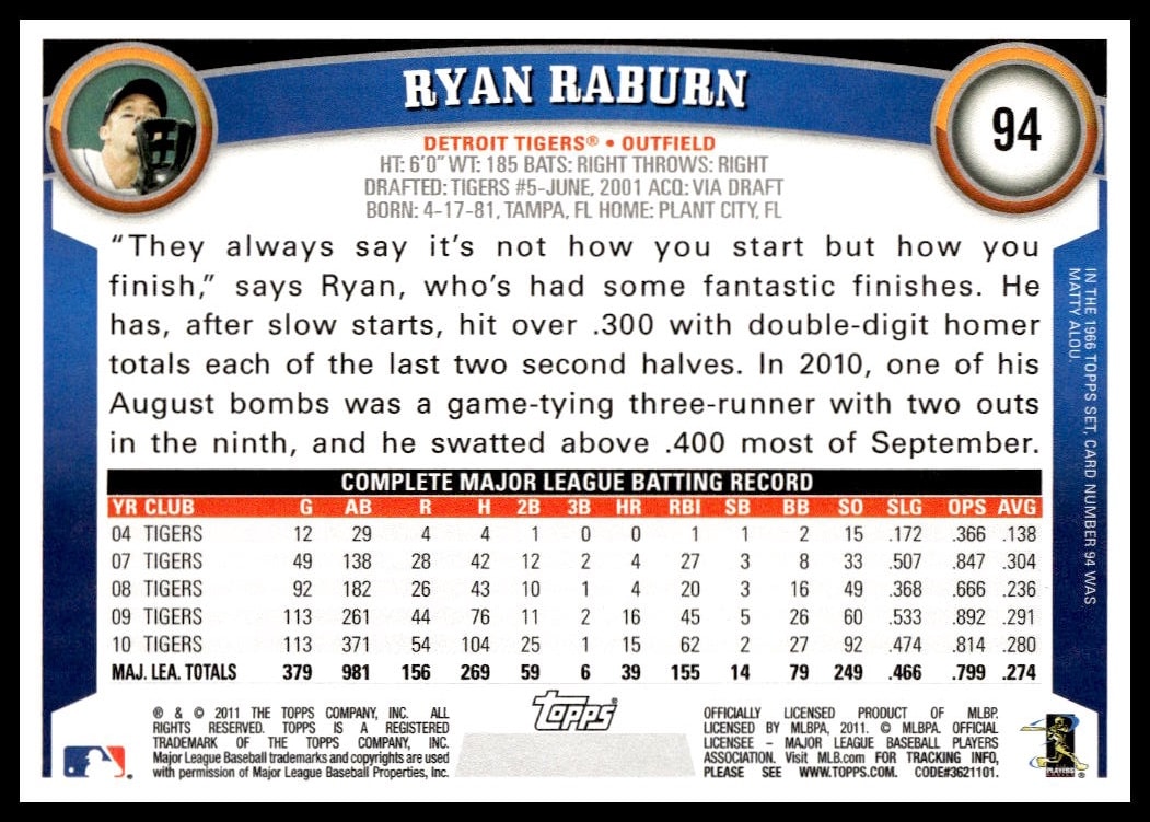 This Baseball card, from 2011 is part of the Topps  card set. Ryan Raburn is featured and has a card number of 94.