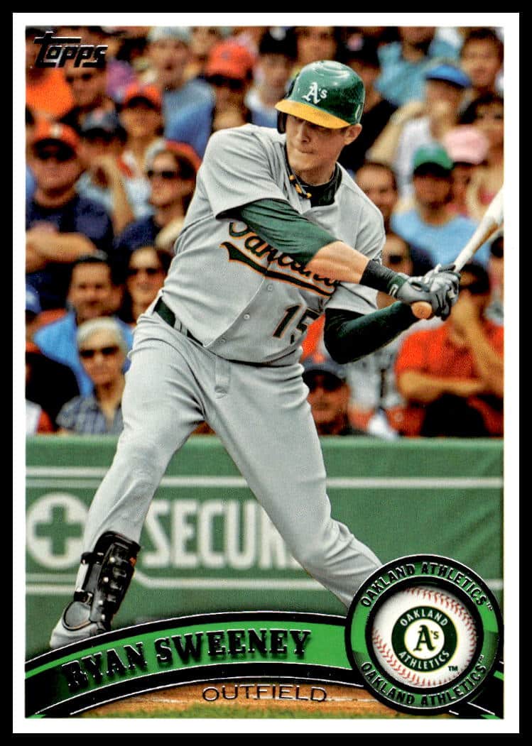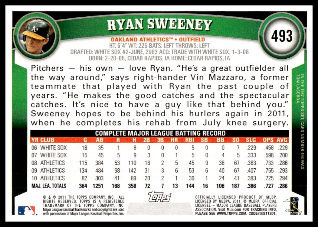 This Baseball card, from 2011 is part of the Topps  card set. Ryan Sweeney is featured and has a card number of 493.