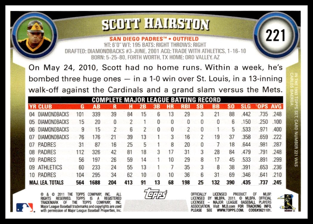 This Baseball card, from 2011 is part of the Topps  card set. Scott Hairston is featured and has a card number of 221.