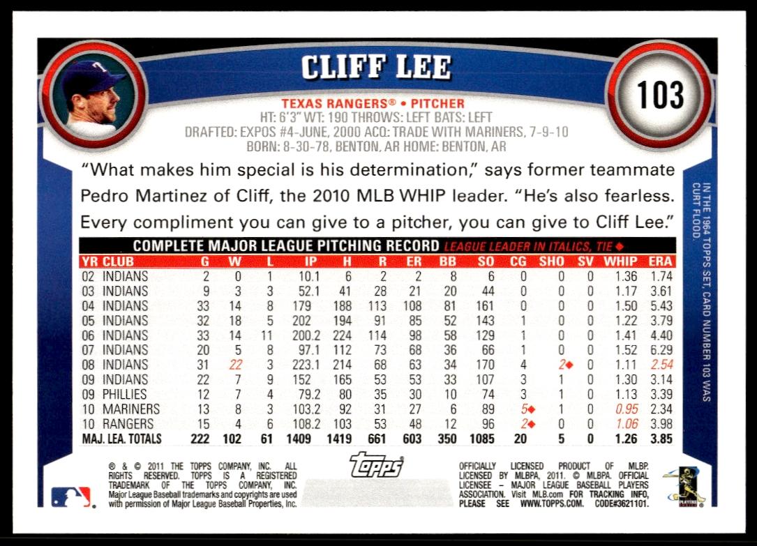 This BaseballΒ card, from 2011 is part of the Topps Series 1Β card set. Cliff Lee is featured and has a card number of 103.