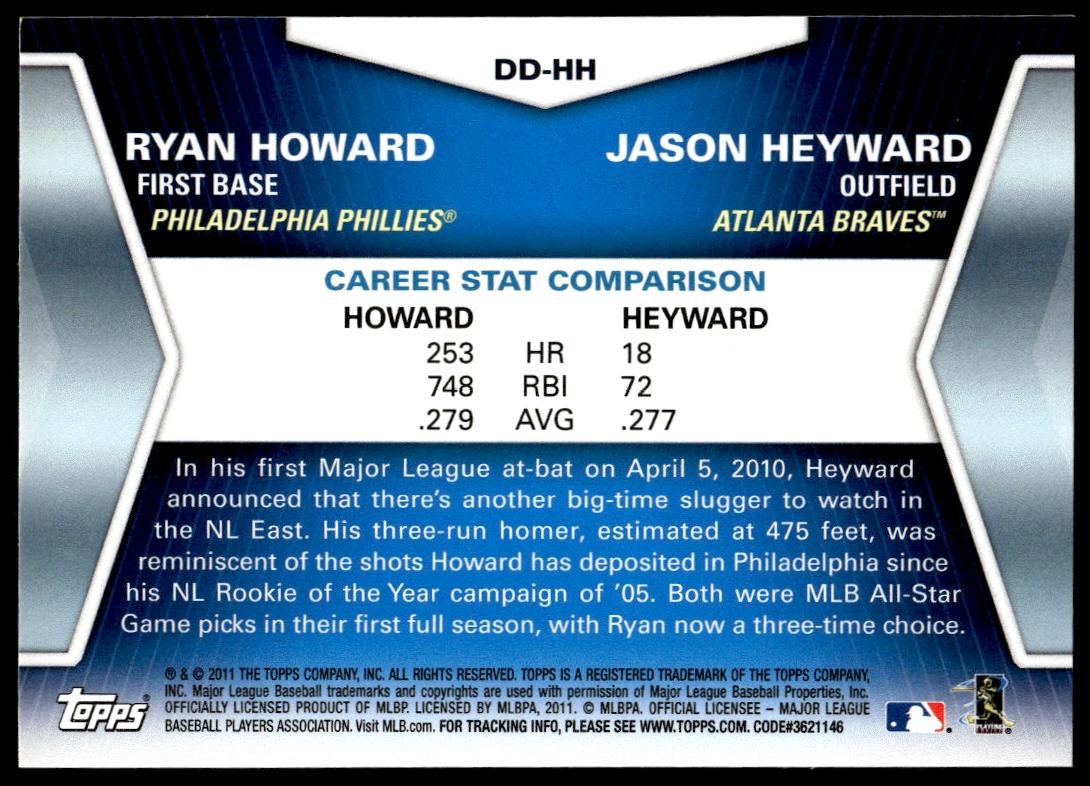 This Baseball card, from 2011 is part of the Topps Series 1 card set. Ryan Howard / Jason Heyward is featured and has a card number of DD-HH.
