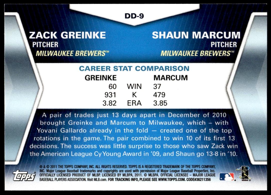 This BaseballΒ card, from 2011 is part of the Topps Series 1Β card set. Zack Greinke / Shaun Marcum is featured and has a card number of DD-9.