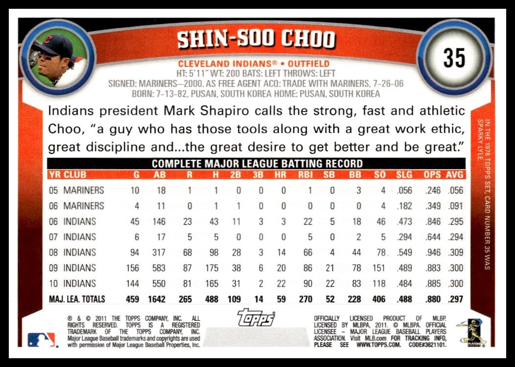 This Baseball card, from 2011 is part of the Topps  card set. Shin-Soo Choo is featured and has a card number of 35.