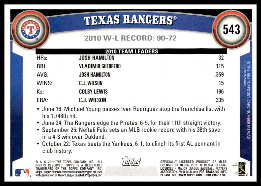 This Baseball card, from 2011 is part of the Topps  card set. Texas Rangers is featured and has a card number of 543.