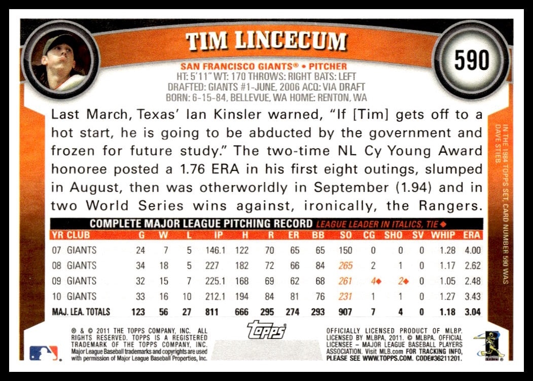 This Baseball card, from 2011 is part of the Topps  card set. Tim Lincecum is featured and has a card number of 590.