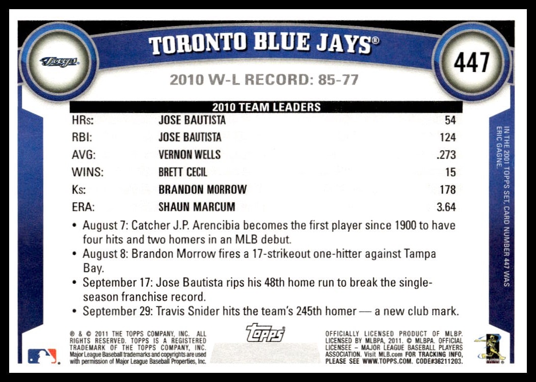This BaseballΒ card, from 2011 is part of the Topps Β card set. Toronto Blue Jays is featured and has a card number of 447.
