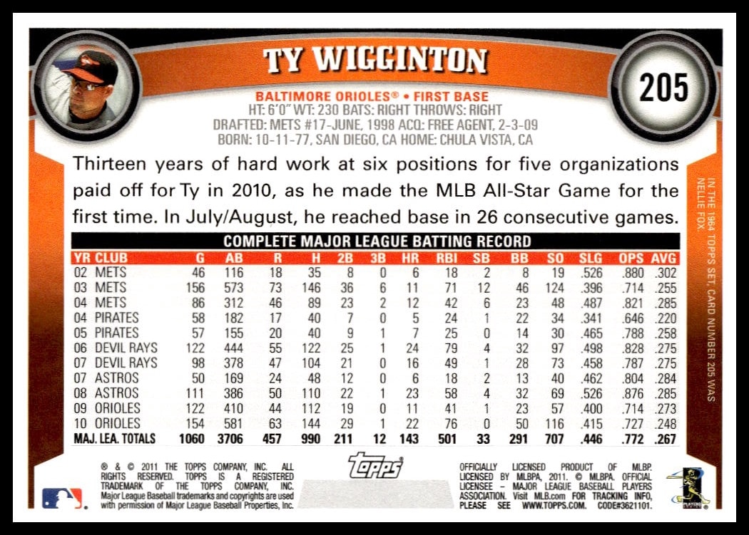 This Baseball card, from 2011 is part of the Topps  card set. Ty Wigginton is featured and has a card number of 205.