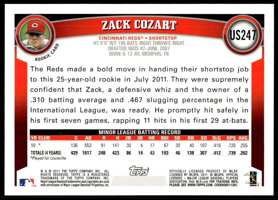 This BaseballΒ card, from 2011 is part of the Topps UpdateΒ card set. Zack Cozart is featured and has a card number of US247.